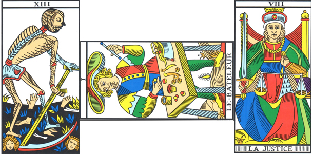 Il primo Arcano a sinistra, L’Arcano Senza Nome è uscito per comunicare il momento in cui si trova. Il Mago estratto per capire che aspetti sono contrari alla sua situazione lavorativa e La Giustizia l’Arcano che gli dà una mano per superare gli ostacoli presentati da Il Mago.